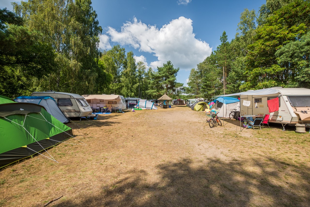 Samochody parkowane są na parkingach ośrodka (bezpłatnych, niestrzeżonych) lub przy samym polu namiotowym.
